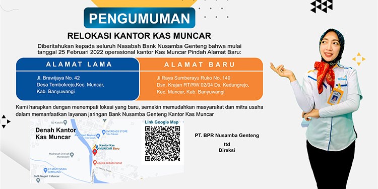 08 Feb RELOKASI KANTOR KAS MUNCAR Sehubungan dengan pemindahan kantor PT. BPR Nusamba Genteng Kas Muncar pada tanggal 25 Februari 2022... Berita Cabang